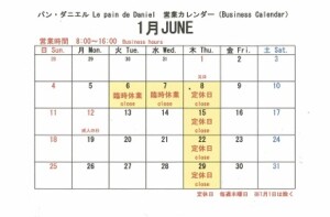 24Dec2025 2026年1月の定休日のご案内 Tweet Share いつもパン・ダニエルをご愛顧いただき、誠にありがとうございます。 1月の定休日・臨時休店日についてお知らせ致します。 【1月臨時休店日】 1/6、1/7 【1月定休日 毎週木曜日】 定休日毎週木曜 1/8、1/15、1/22、1/29 *定休日・臨時休店日が合わさり1/6~1/8がお休みとなり3連休 になりますのでご注意ください。 お客様のご来店心よりお待ちしております。 何かご不明な点やご質問がございましたら、お気軽にお問い合わせください。 Tweet Share 2025年12月の定休日 のご案内 最近のお知らせ一覧お知らせ一覧 2025年12月の定休日 のご案内 2025.09.18 おすすめ商品 2025.05.14 SDGsタイムセール 2025.01.29 営業時間 2024.09.06