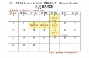 16Feb2026 2026年3月の定休日のご案内 Tweet Share いつもパン・ダニエルをご愛顧いただき、誠にありがとうございます。 3月の定休日・臨時休店日についてお知らせ致します。 【3月臨時休店日】 3/10(火) 、 3/11(水) 【3月定休日 毎週木曜日】 定休日毎週木曜 3/5、3/12、3/19 *定休日・臨時休店日が合わさり3/10~3/12がお休みとなり3連休 になりますのでご注意ください。 お客様のご来店心よりお待ちしております。 何かご不明な点やご質問がございましたら、お気軽にお問い合わせください。 Tweet Share 2026年2月の定休日 のご案内 最近のお知らせ一覧お知らせ一覧 2026年2月の定休日 のご案内 2026.01.17 おすすめ商品 2025.05.14 SDGsタイムセール 2025.01.29 営業時間 2024.09.06