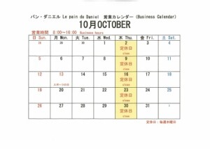 18Sep2025 2025年10 月の定休日 のご案内 Tweet Share 皆さま、こんにちは。パン・ダニエルをいつもご愛顧いただき、誠にありがとうございます。 10月の定休日についてお知らせ致します。 【10月定休日 毎週木曜日】2日、9日、16日、23日、30日 お客様のご来店心よりお待ちしております。 何かご不明な点やご質問がございましたら、お気軽にお問い合わせください。 Tweet Share おすすめ商品 2025年11月の定休日のご案内 最近のお知らせ一覧お知らせ一覧 2025年11月の定休日のご案内 2025.10.20 おすすめ商品 2025.05.14 SDGsタイムセール 2025.01.29 営業時間 2024.09.06