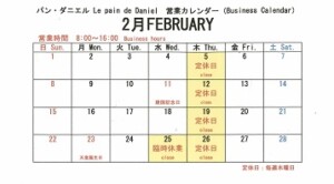 17Jan2026 2026年2月の定休日 のご案内 Tweet Share 皆さま、こんにちは。パン・ダニエルをいつもご愛顧いただき、誠にありがとうございます。 2月の定休日についてお知らせ致します。 【2月定休日 毎週木曜日】5日、12日、19日、26日 【2月臨時休業】 25日 *25日、26日がお休みとなり2連休となります。誠に申し訳ございません。 お客様のご来店心よりお待ちしております。 何かご不明な点やご質問がございましたら、お気軽にお問い合わせください。 Tweet Share 2026年1月の定休日のご案内 最近のお知らせ一覧お知らせ一覧 2026年1月の定休日のご案内 2025.12.24 おすすめ商品 2025.05.14 SDGsタイムセール 2025.01.29 営業時間 2024.09.06