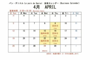 19Mar2026 2026年4月の定休日 のご案内 Tweet Share 皆さま、こんにちは。パン・ダニエルをいつもご愛顧いただき、誠にありがとうございます。 4月の定休日についてお知らせ致します。 【4月定休日 毎週木曜日】9日、16日、23日、 【4月臨時休業】 15日、22日 *15日、16日がお休みとなり2連休となります。 22日、23日がお休みとなり2連休となります。 誠に申し訳ございません。 お客様のご来店心よりお待ちしております。 何かご不明な点やご質問がございましたら、お気軽にお問い合わせください。 Tweet Share 2026年3月の定休日のご案内 最近のお知らせ一覧お知らせ一覧 2026年3月の定休日のご案内 2026.02.16 おすすめ商品 2025.05.14 SDGsタイムセール 2025.01.29 営業時間 2024.09.06